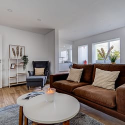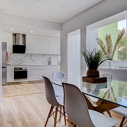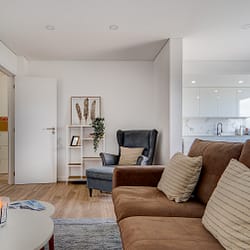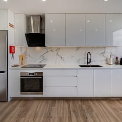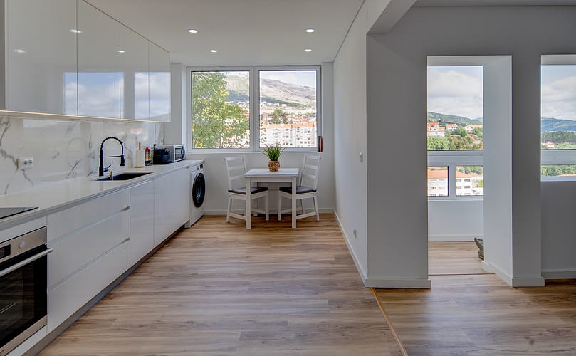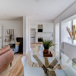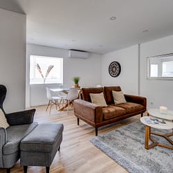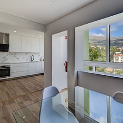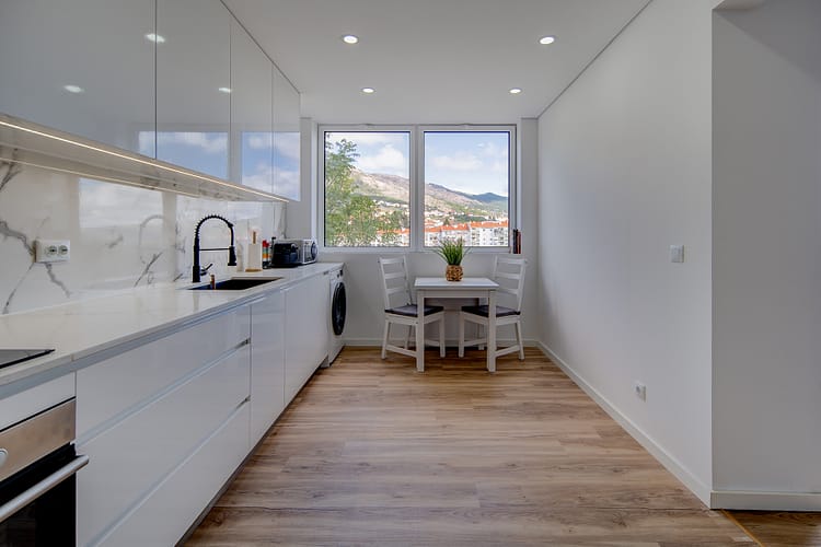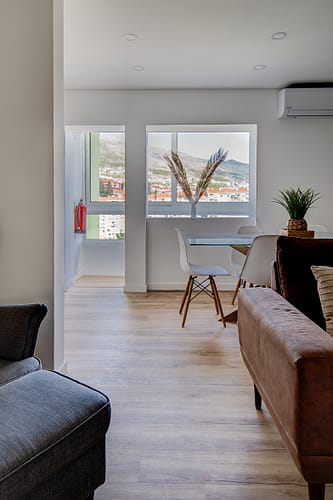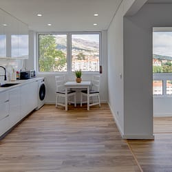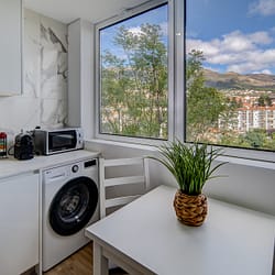 Spacious modern fully renovated apartment is equipped with 2 bedrooms, 1 bathroom, AC in every room, bed linen, towels, a flat-screen TV with streaming services, a dining area, a fully equipped kitchen, and a balcony with mountain views.